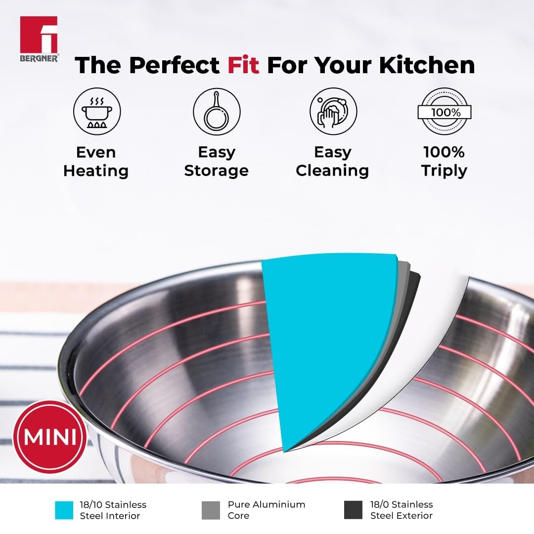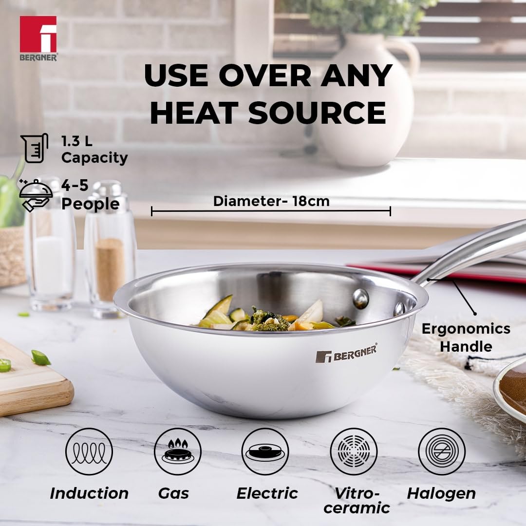 Bergner Argent Junior Chef Triply Stainless Steel 18 cm Wok, 1.3 litres Wok/Kadai, Mini Wok with Sturdy and Durable, Mirror Finish, Induction Base and Gas Ready, Silver