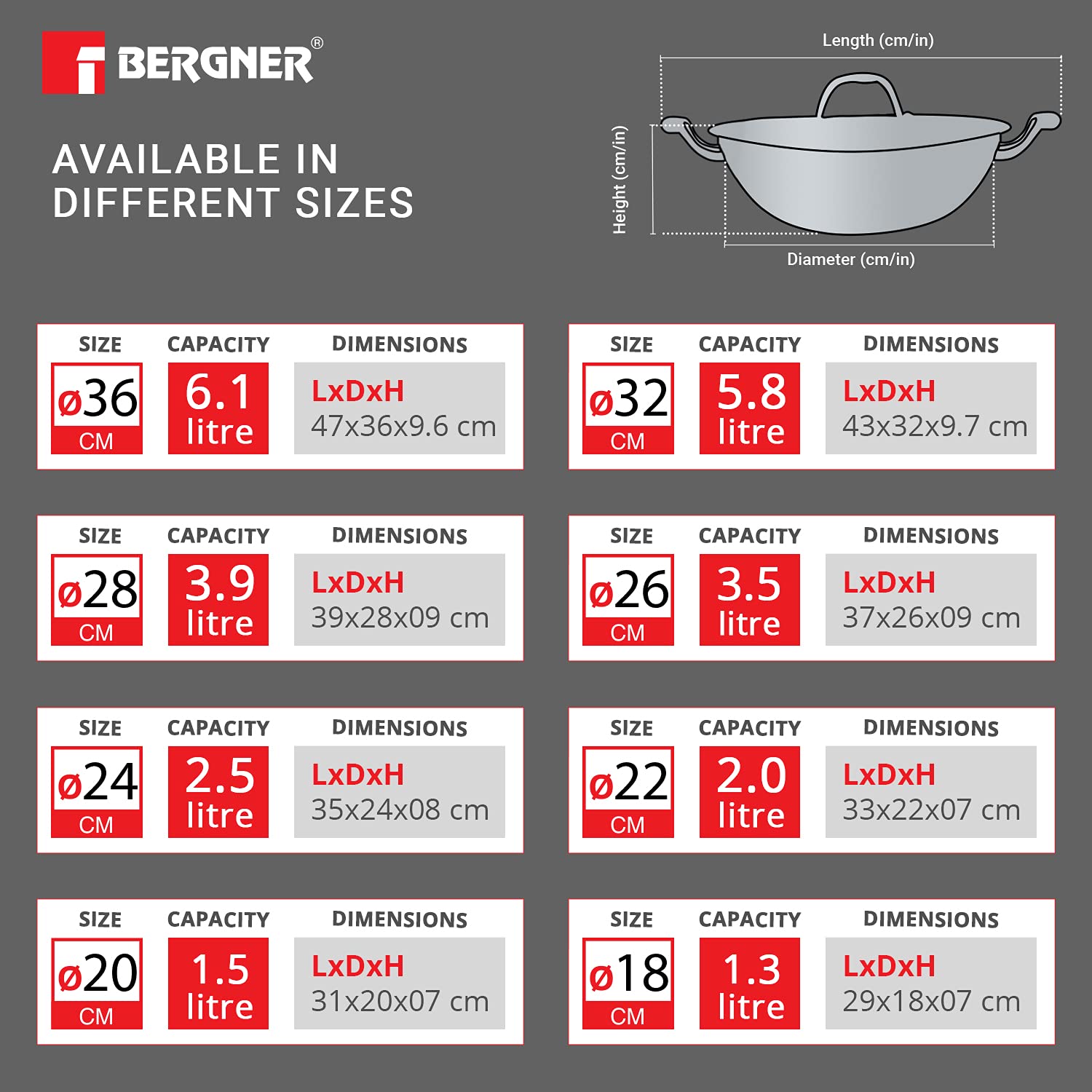 Bergner Argent TriPly Stainless Steel Kadai with Stainless Steel Lid, Kadhai with Lid, Food Safe, Stay Cool Cast Handles, Dishwasher Safe -Induction Bottom and Gas Stove Read