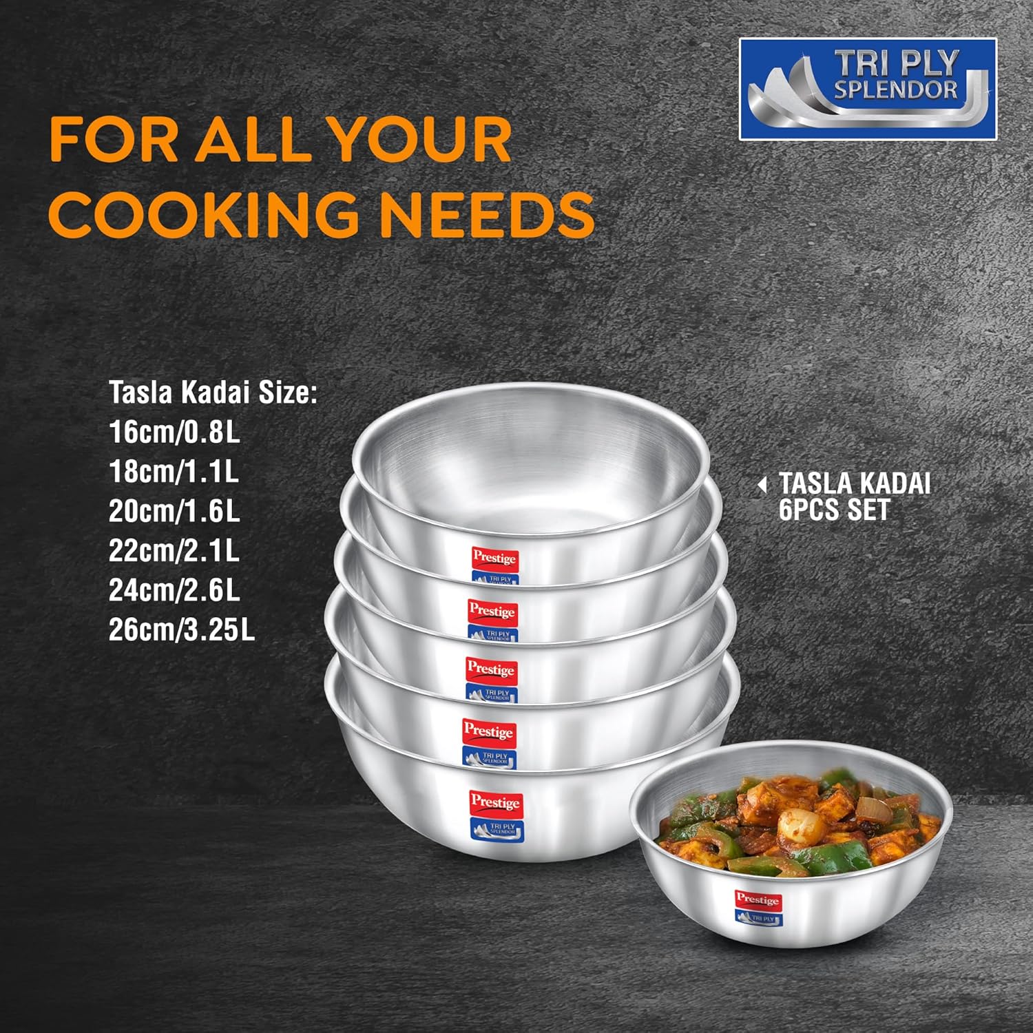 Prestige 6-Piece Tri-Ply Stainless Steel Tasla Kadai Set with Free Pakkad|Gas & Induction Compatible|Even Heat Distribution| Durable Rust-Proof Interior| Space Saving Design