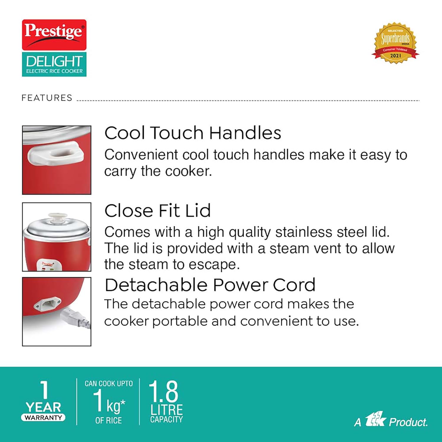 Prestige Delight Cute 1.8 SS Bowl Electric Rice Cooker(1.8L for Rice-Open Type, Silky Red, with Stainless Steel Cooking Pan 4.4L Volume,700 W)