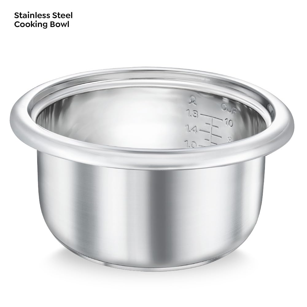 - Stainless Steel Cooking Pan 4.4L Volume, Sandwich Bottom: The durable stainless steel cooking pan comes with a sandwich bottom, which ensures uniform distribution of heat for efficient and even cooking of rice.