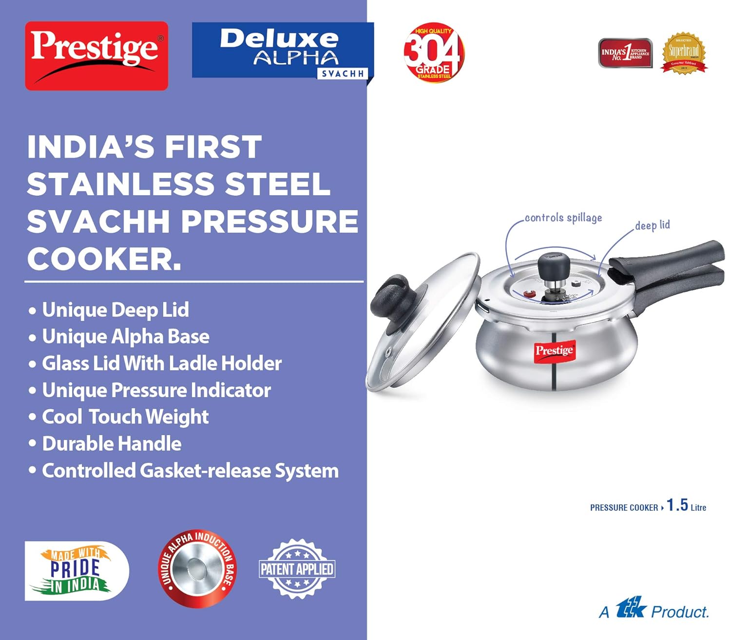 Prestige Deluxe Alpha Svachh Stainless Steel Outer Lid Pressure Cooker 1.5 Liter With Glass Lid(With Deep Lid For Spillage Control)
