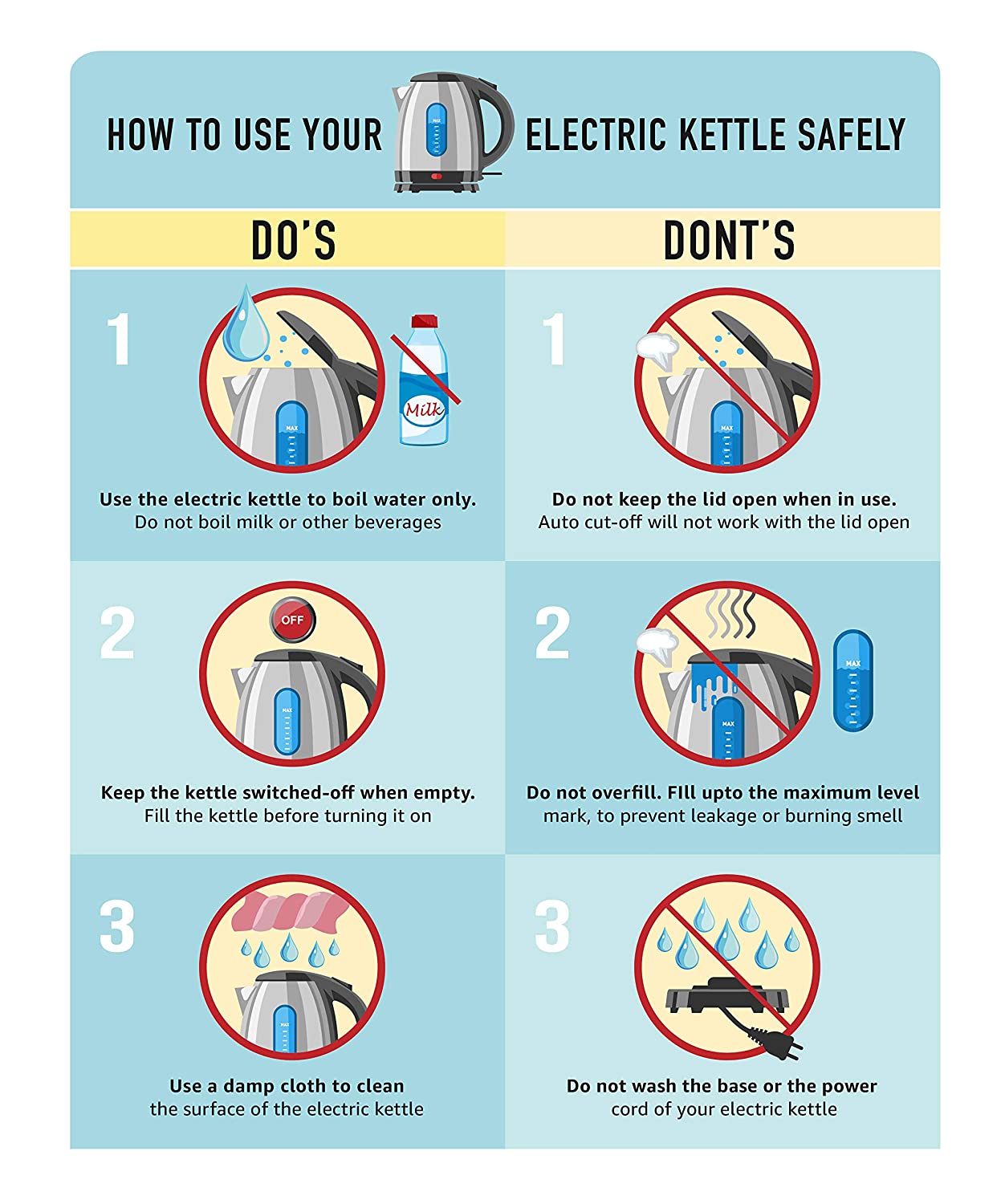 - Warranty: 1 Year Troubleshooting guidelines: Never operate the appliance empty, Never lift the kettle from the base when the unit is in operation