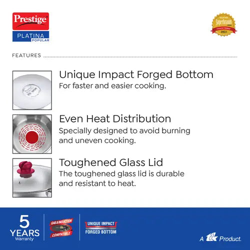 Prestige Platina Popular Stainless Steel Unique Impact Forged Bottom Kadai with Toughened Glass Lid(Silver)