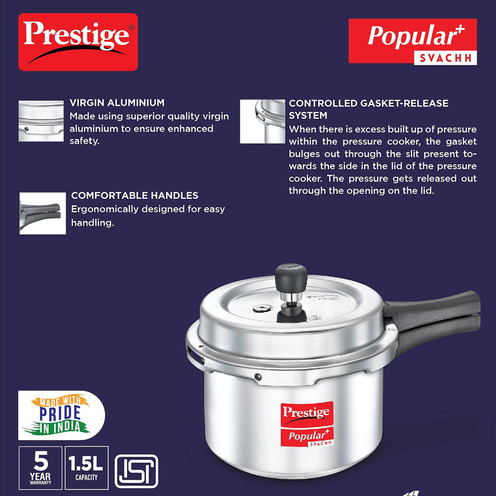 The widely used and appreciated Prestige Cooker comes with top of the line features. Manufactured from virgin Aluminum to ensure zero contamination, this cooker boasts of highest quality of raw materials used. Add to that the elegant design and splendid finish, this cooker is a sheer pleasure to cook with. Cooking rice or boiling vegetables - everything becomes easy with this pressure cooker from Prestige. Featuring an Aluminium Body and Durable Handles, this pressure cooker is both convenient and pleasing to look at. Also, with features such as the Precision Weight Valve and the Metallic Safety Plug, safety is assured. PLEASE CHECK THE IMAGES FOR SIZES WARRANTY-5YRS For any warranty related issues, please call the Prestige Customer Support - 9535621112 / 8056777073 / Kitchen & Cookware: 1800-123-334411 websitecustomer.support@prestigesmartkitchen.com Kitchen & Cookware: customercare@ttkprestige.com