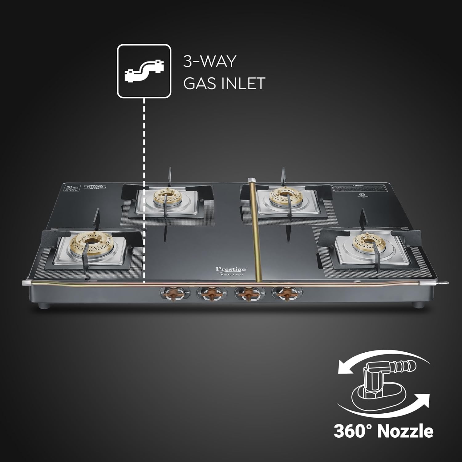 Prestige Vectra r Glasstop Gas Stove|Superior Toughened Glass|Jumbo Brass Burner|3-Way Gas Inlet|360 Degree Revolving Nozzle|10 Years Warranty on Glass|Black