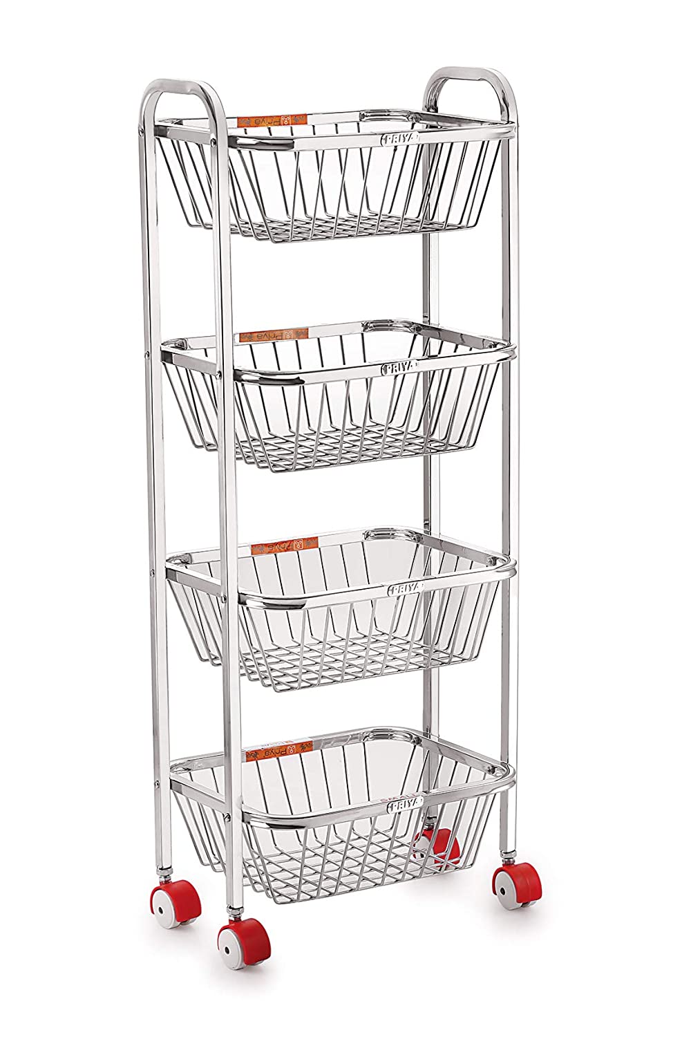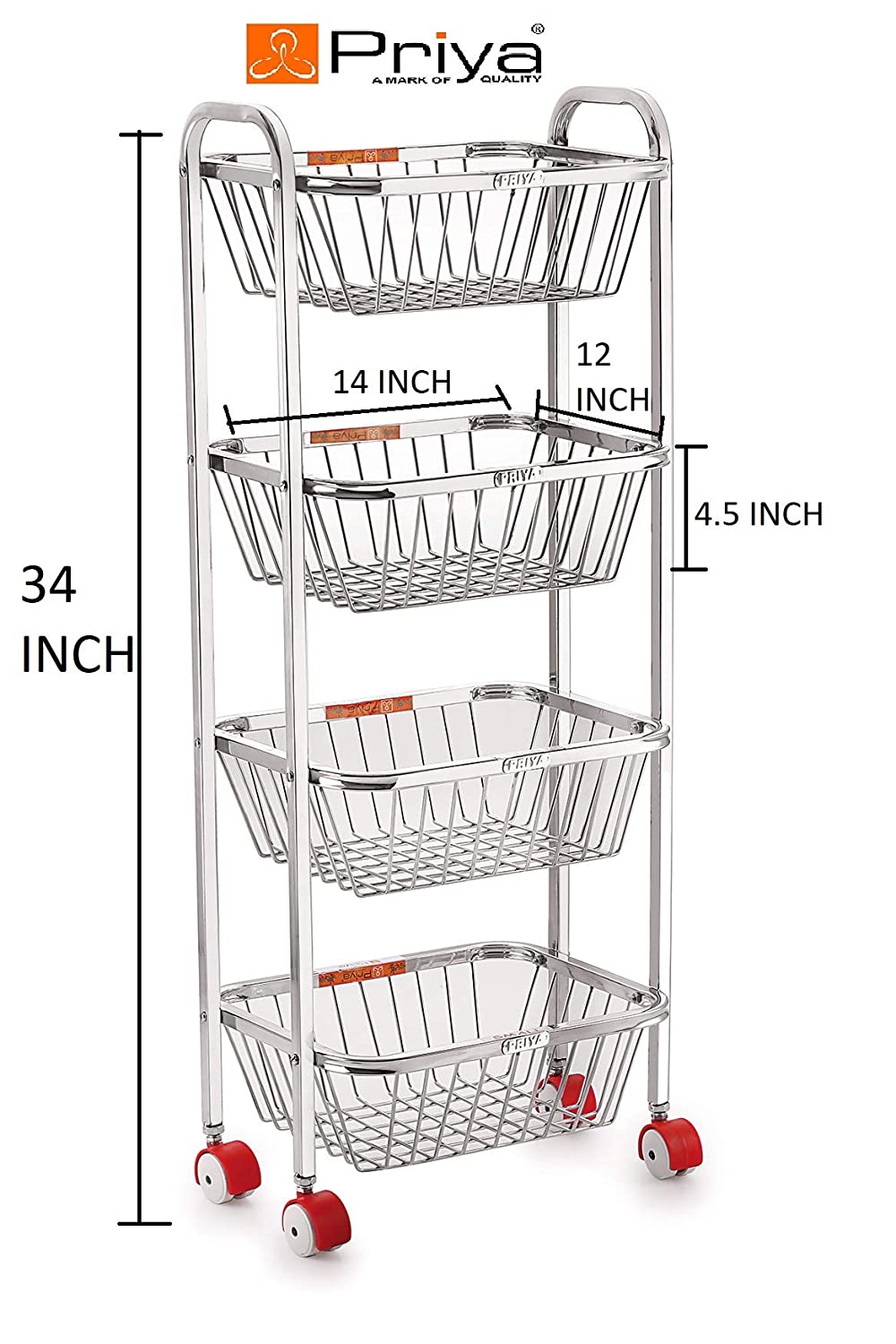 - Package contents: 1-piece 4 stack fruit trolley, overall height 34 inch, basket size length-14inch width-12inch height- 4.25inch approx