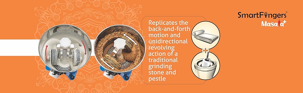 - Replicates the back-and-forth motion and unidirectional revolving action of a traditional grinding stone and pestle