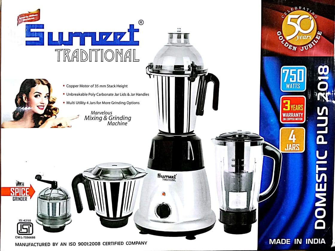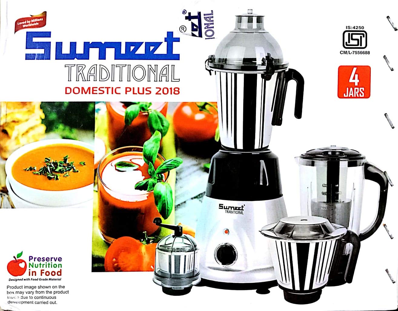 Sumeet Traditional Domestic Plus 2018 750W Mixer Grinder with 4 Jars, White