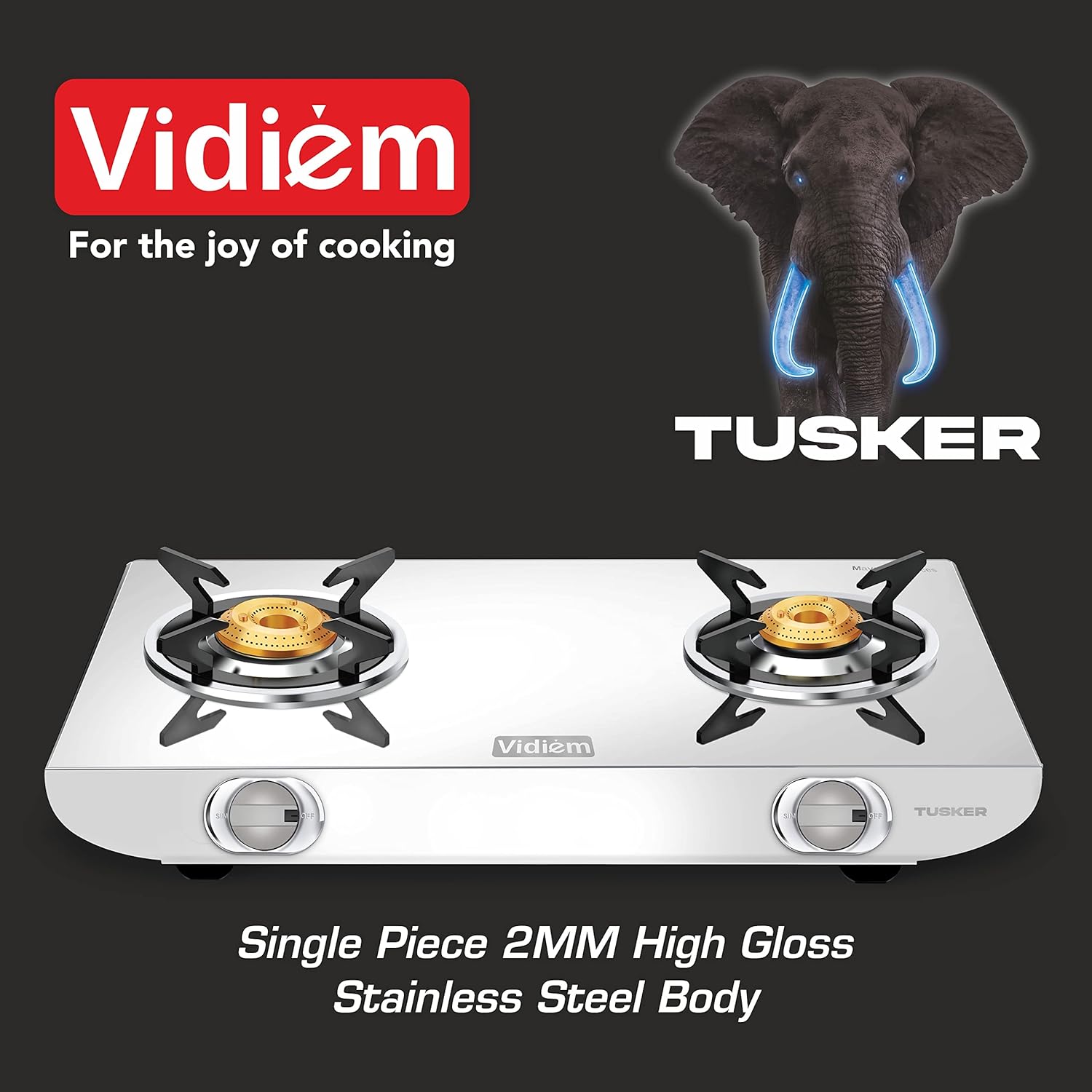 - ✅ Vidiem Tusker 2mm High Gloss SS Body, Extra Large Cooking Surface & Widely Spaced Burners to accommodate Large Vessels with Jumbo, Medium & Small Dura Forged Brass Burners.