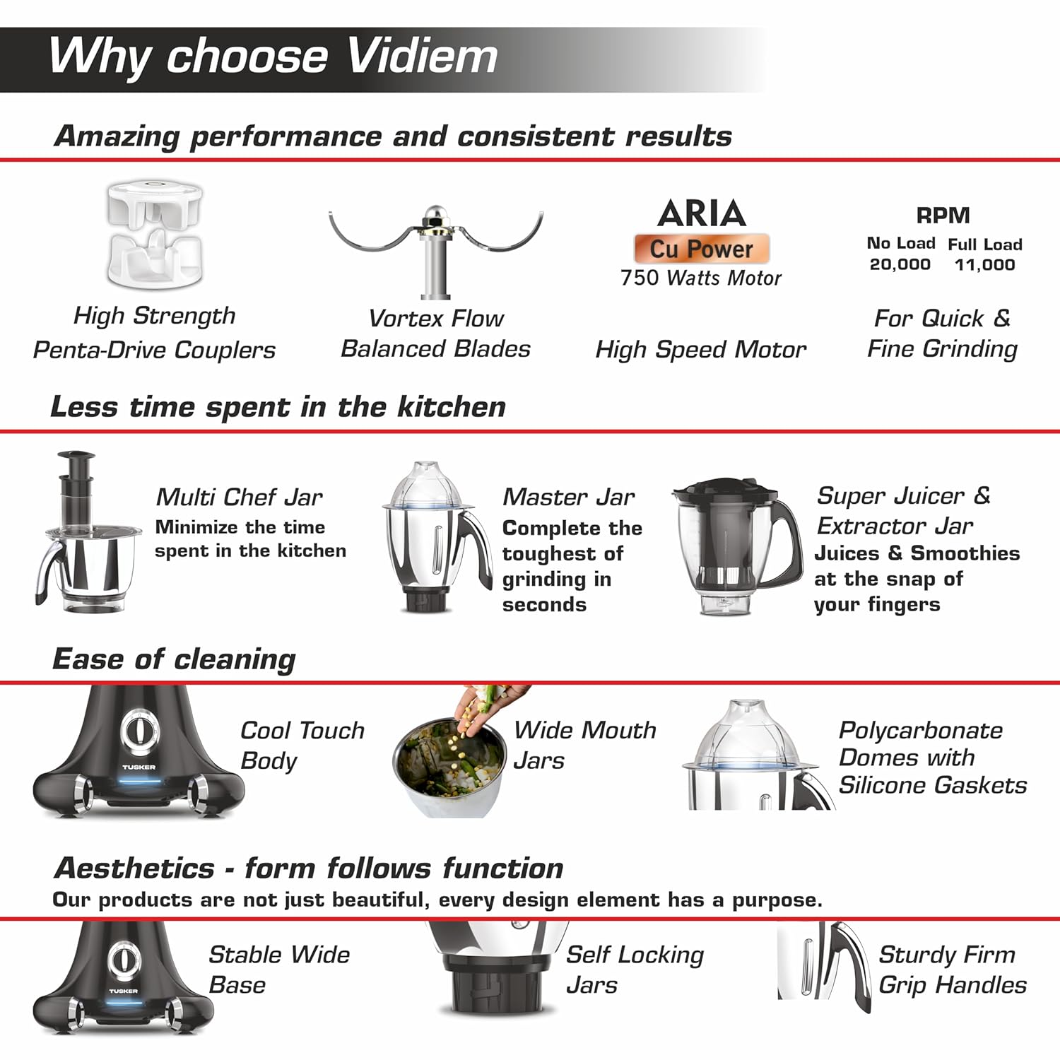 Vidiem Mixer Grinder 608 A Tusker | Mixer grinder 750 watt with 3 Jars & 1 Juicer Mixer Grinder, 1 Multi chef | 4 Leakproof Jars with self-lock for wet & dry spices, chutneys | 5 Years Warranty