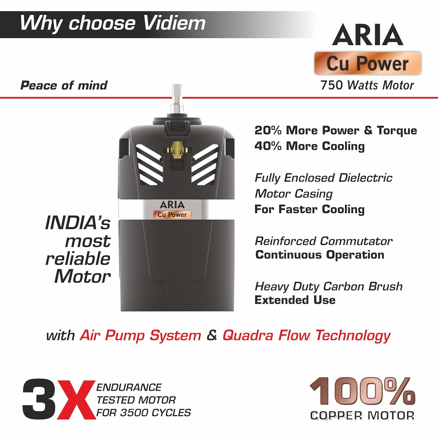 - ✅ 5 Year Warranty on Motor & 2 Year Warranty on Product- Aria Cu Power 750 Watts 100% Copper Motor with 4 Speeds (Patent pending) with Air Pump System & Quadra Flow Technology, fully enclosed Di-electric Motor Casing provides 40% more cooling, 20% more torque, 20% more power & 10% less power consumption.