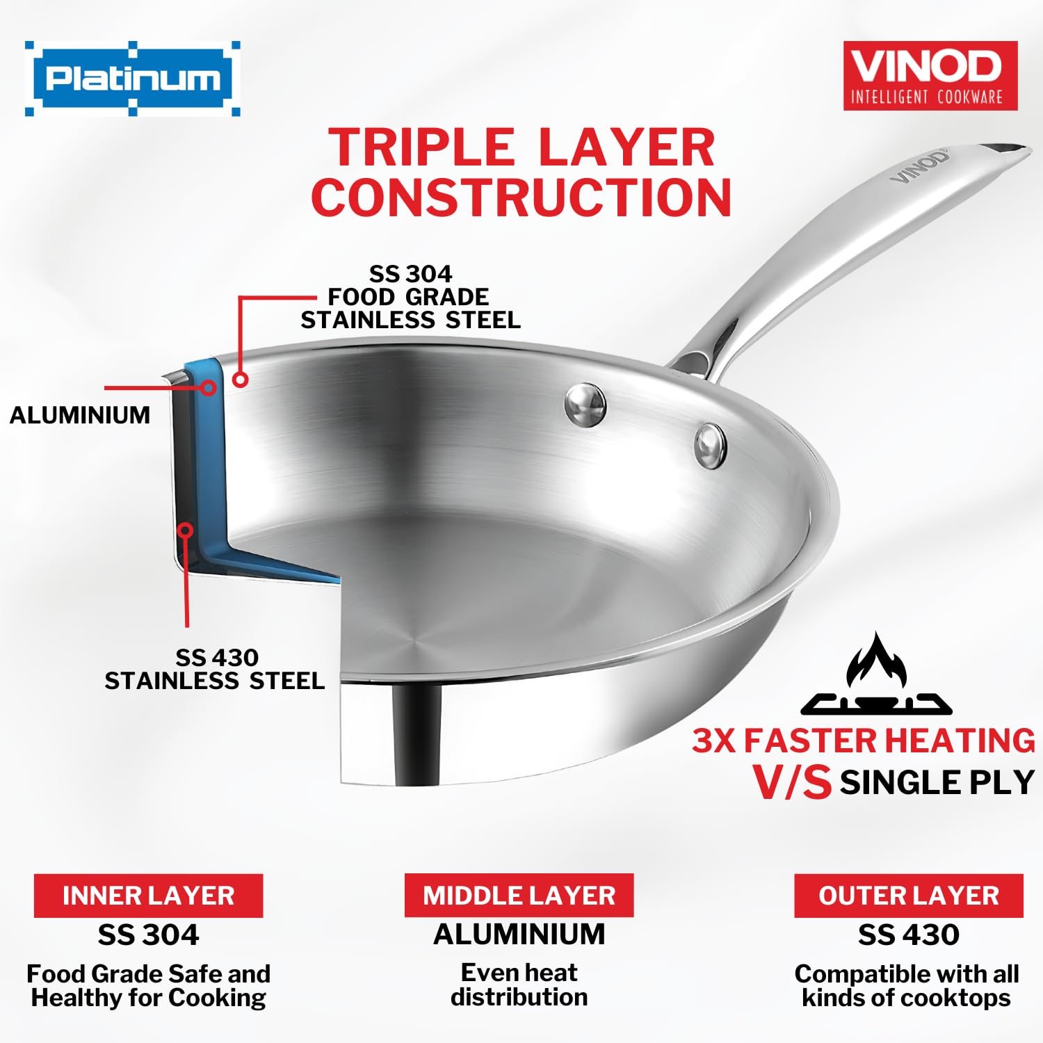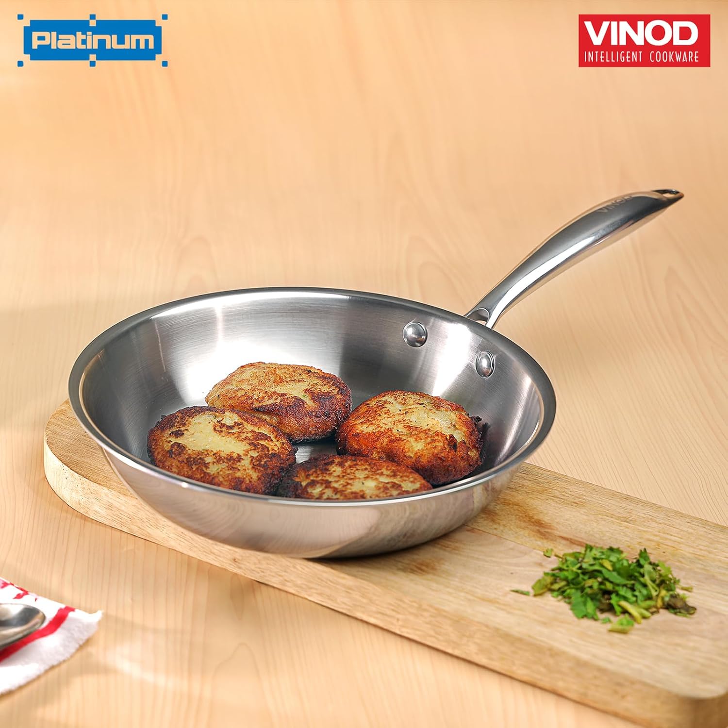 Vinod Platinum Triply Stainless Steel Frypan | 2.5 mm Thick | Steel Pan | Scratch Resistant, Non Toxic | 5 Year Warranty | Induction & Gas Friendly, Heavy Bottom