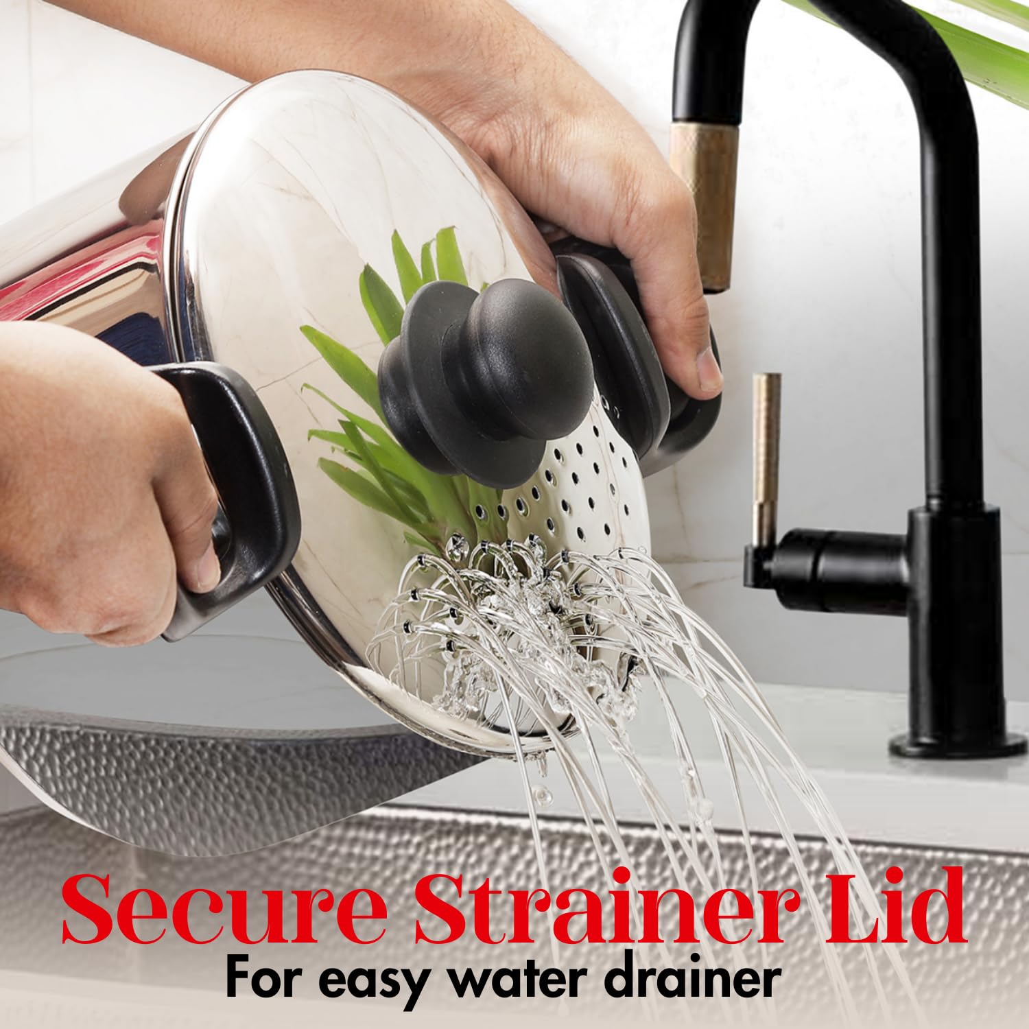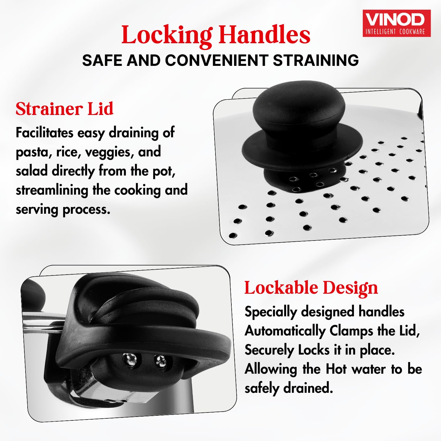 Vinod Stainless Steel Pasta, Rice Pot with Strainer lid , SAS Bottom Rice Steamer Cooker, Noodles, Veggies Boiler Pot with Locking Handles, Induction Base