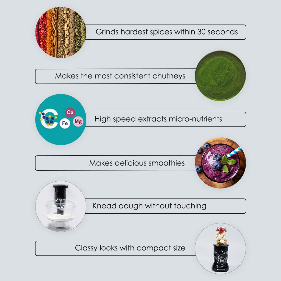 Powerful Motor: The compact yet powerful machine grinds the toughest of chutneys and masalas, and ensures nutrition extraction from all fruits and veggies thanks to its incredibly high speed of 22,000 RPM, which is almost twice that of normal mixer-grinders