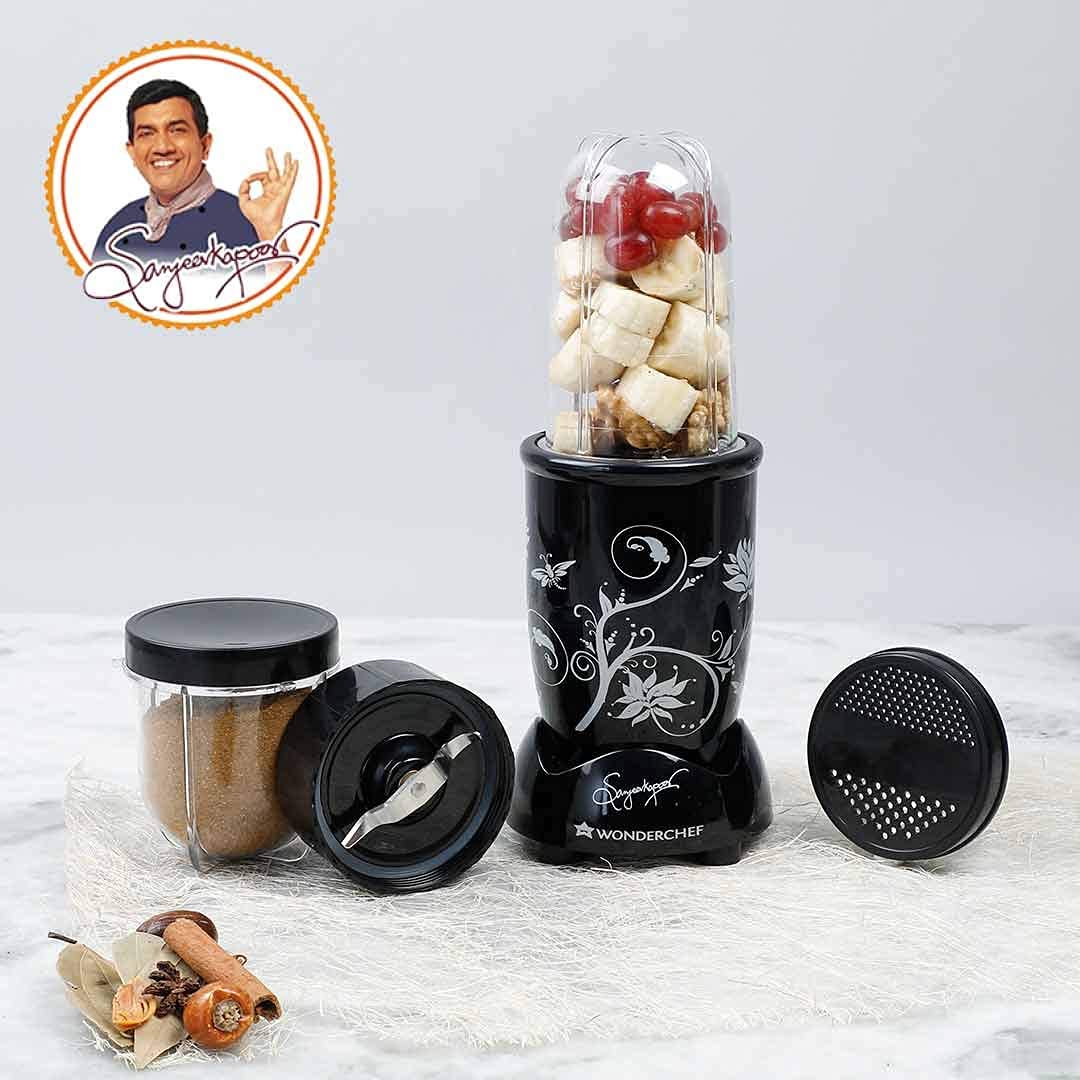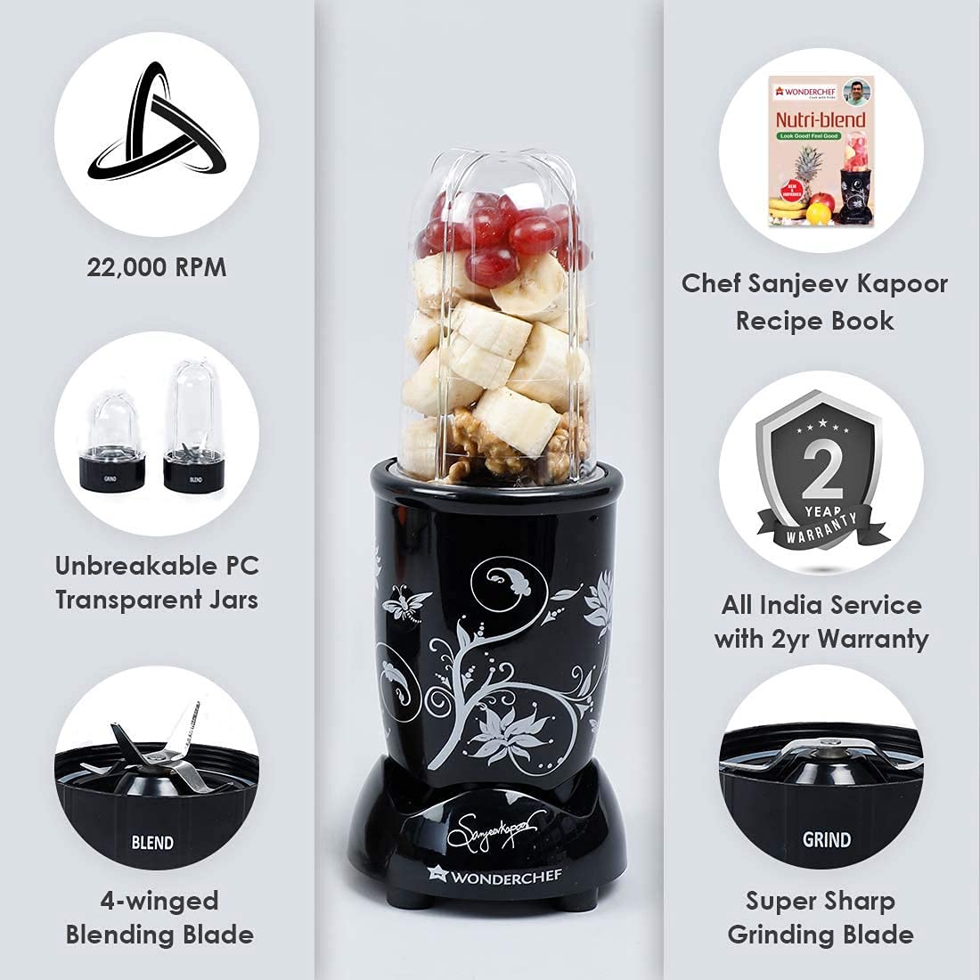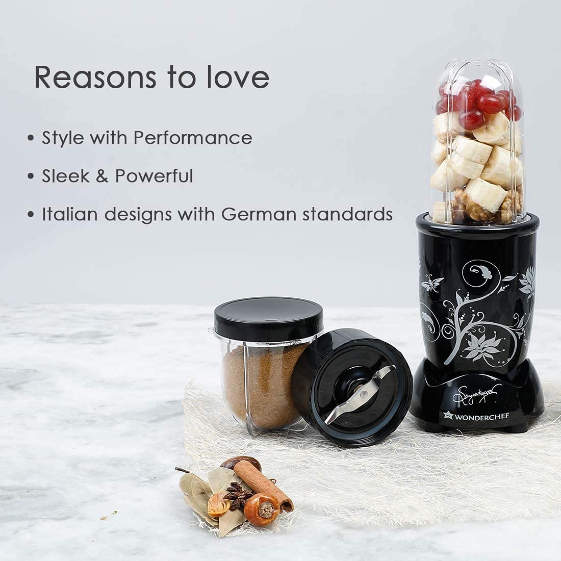 Specialised Functions: The Long Jar (500ml) comes with 4-wing blade for mixing-blending and the Short Jar (300ml) with 2-wing flat blade for grinding to make all kinds of chutneys, shakes, smoothies and masalas. Two useful lids – for storing and sprinkling come with the product
